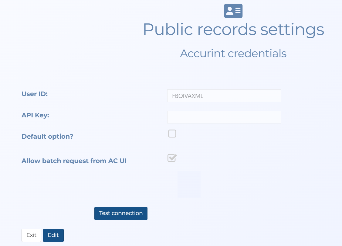 The Public records settings screens allow you to enter either your CLEAR or Whooster credentials so that