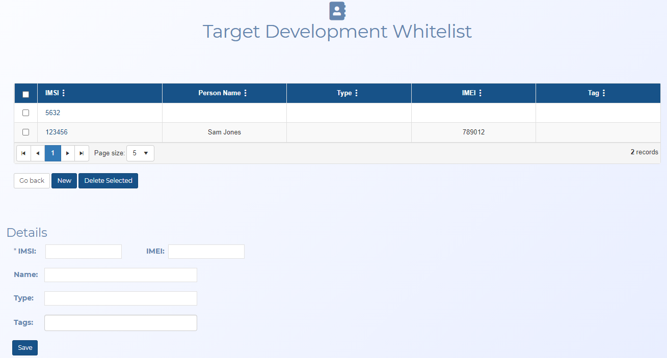 The Target development whitelist screen allows you to manage IMSIs that you do not want to be included in the target development analysis, such as phones possessed by known individuals. Once saved on this screen they will not be displayed on the Target development screen.