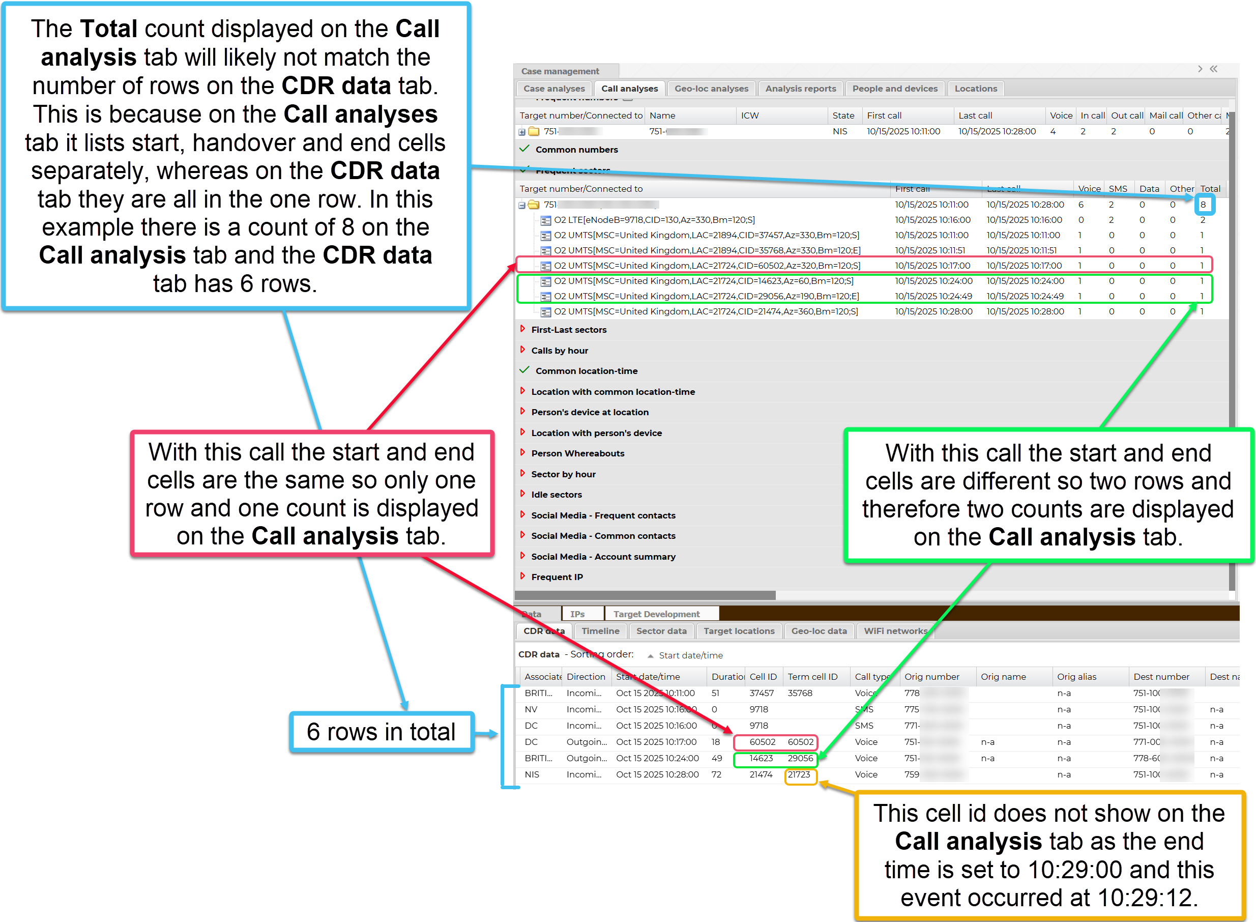NOTE: The Total count displayed on the Call analysis tab will likely not match the number of rows on the CDR data tab. This is because on the Call analyses tab it lists start, handover and end cells separately, whereas on the CDR data tab they are all in the one row. For example, in the following graphic there is a count of 8 on the Call analysis tab and the CDR data tab has 6 rows.